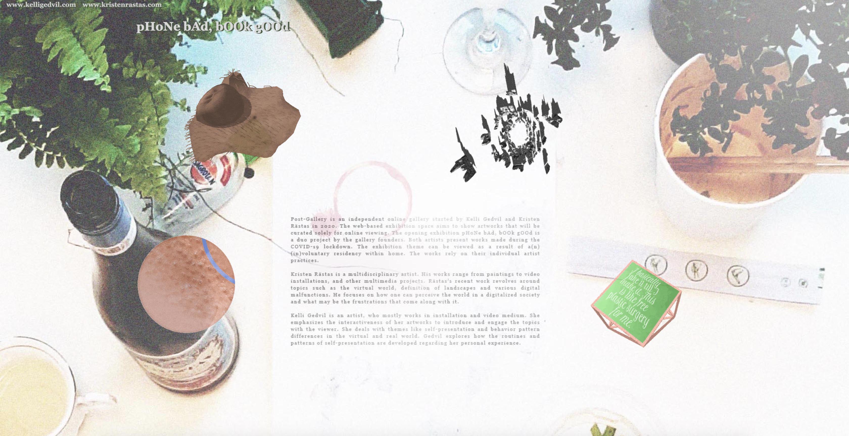post-gallery.online is an independent digital art gallery started by Estonian artists Kelli Gedvil and Kristen Rästas in the spring of 2020. The goal of the gallery is to be available in every corner of the world, because the exhibitions do not require a physical space. The art exhibitions are carefully curated according to the possibilities and peculiarities offered by the web environment which gets built from scratch for every new exhibition. Each art exhibition is based on the principle that it covers the entire website with no other references or extraneous information, ensuring the purest and most aesthetic solution possible. post-gallery.online aims to provide contemporary artists a safe space to exhibit their work and to find solutions on how to bring their physical or not-so-physical artworks naturally to a digital environment.